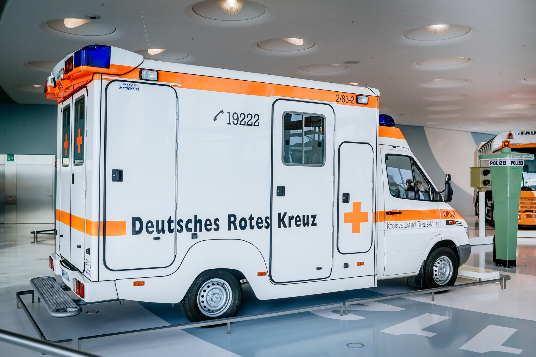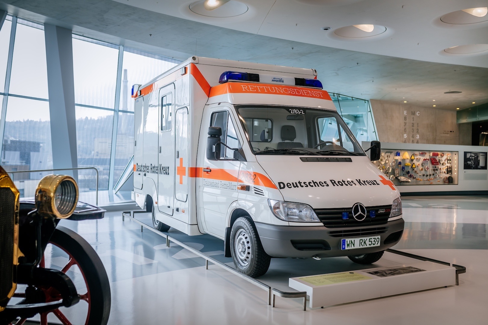 Auffällig: ein Mercedes-Benz Sprinter mit kubischem, weißem Aufbau, Blaulichtanlage sowie Farbakzenten in Tagesleuchtfarbe. So sieht ein typischer Rettungswagen aus, und genau so steht er im Mercedes-Benz Museum. Gut drei Jahre hat das Deutsche Rote Kreuz im Kreisverband Rems-Murr diesen Rettungswagen mit der Funkkennung 2/83-2 aus dem Jahr 2001 eingesetzt. Exakt 111.473 Kilometer hat er in dieser Zeit zurückgelegt.