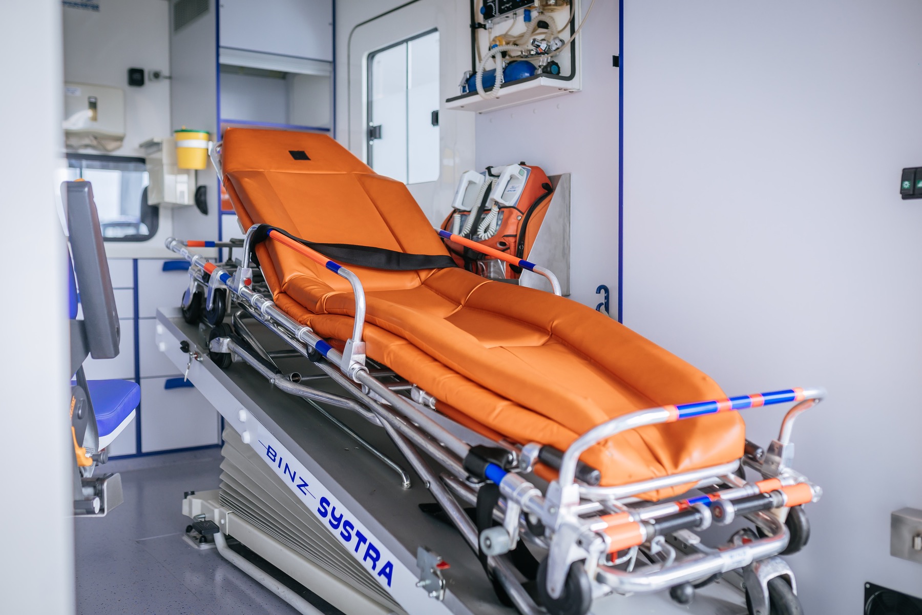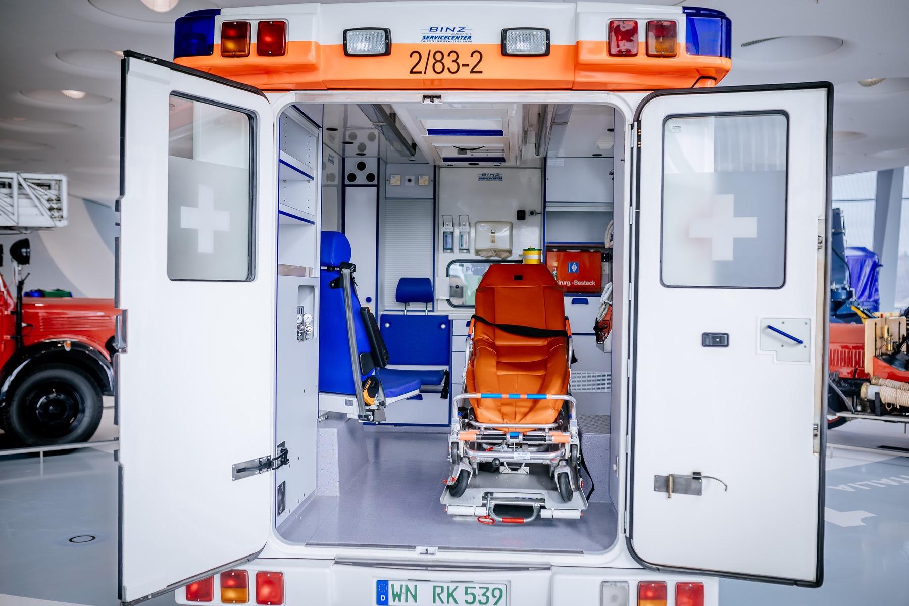 Rollendes Behandlungszimmer: Beim Blick durch die geöffneten Heckflügeltüren des Rettungswagens fällt die Fahrtrage mit ihrem leuchtend orangen Polster ins Auge. Die Liegefläche kann vom Rollwagen gelöst und somit auch per Muskelkraft transportiert werden, etwa in unwegsamem Gelände. Direkt daneben befindet sich ein blauer Sitz inklusive Anschnallgurt, damit Notarzt oder Rettungssanitäter den Patienten während des Transports versorgen können.