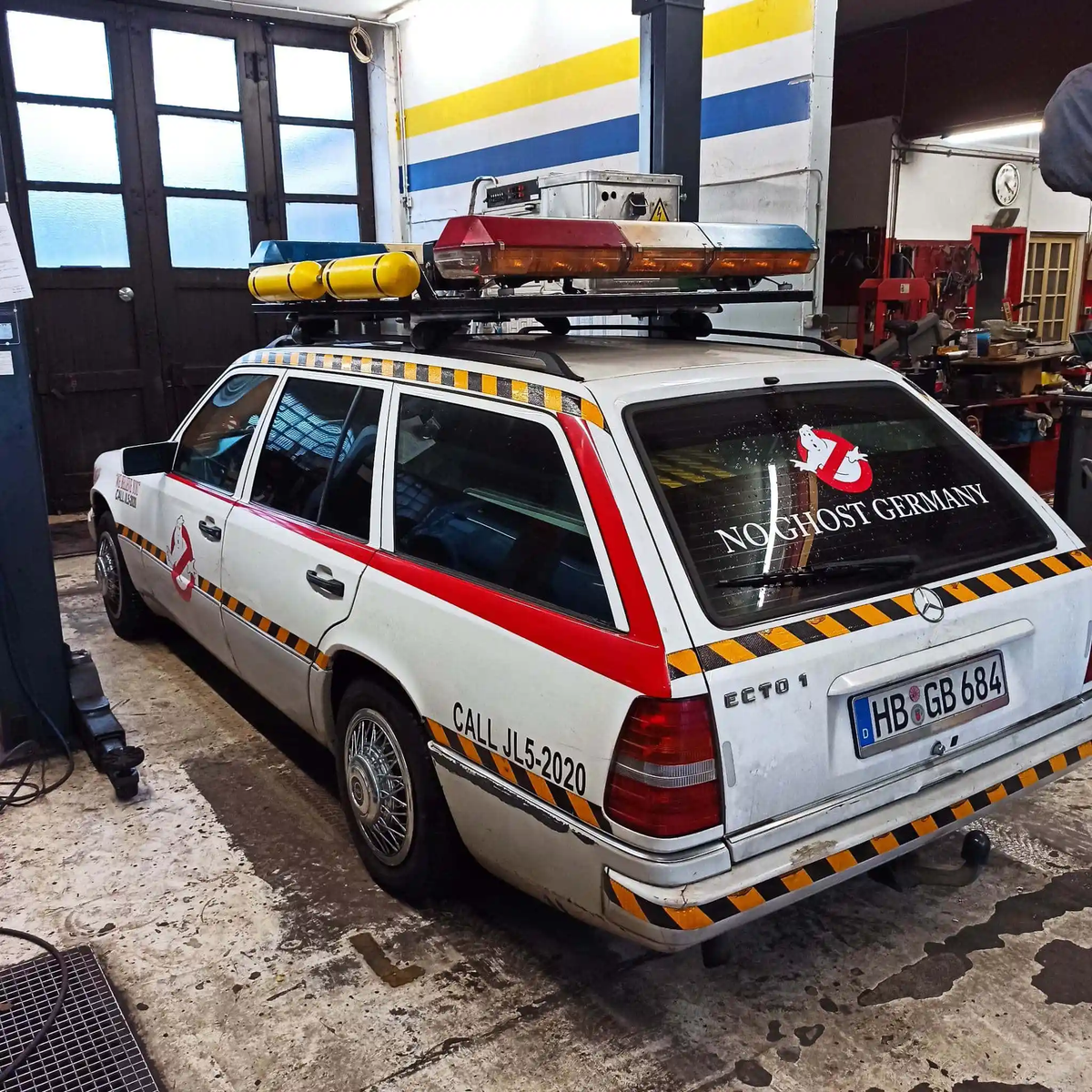 But what does all this have to do with MB-Baureihen.de? Why are we reporting on this? Take a group of Ghostbusters enthusiasts from Bremen, garnish the whole thing with endless attention to detail and an Ecto-1 from the Mercedes plant in Bremen. What do you get? No Ghost Germany! Jörn and Raphael, both from Bremen, are true film fans and the founders of No Ghost Germany, who currently have 15 fellow campaigners from all over Germany to help them. In addition to costumes and accessories, they have everything that makes a ghost hunter's heart beat faster. Of course, they also needed a suitable vehicle. What was needed was a station wagon with enough space and the appropriate roof load capacity for the familiar roof superstructure of the Ecto-1. What could be more appropriate than a vehicle made in Bremen? It ultimately became an S124, which was lovingly redesigned into the iconic vehicle.