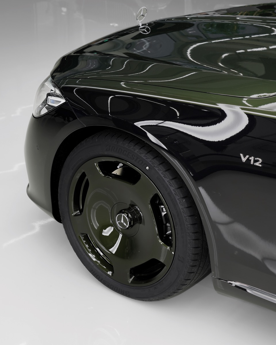 Die Mercedes‑Maybach V12 Edition setzt die Tradition individueller Handwerkskunst der Marke durch das exklusive MANUFAKTUR Programm fort. Eine markante Zweifarblackierung – MANUFAKTUR Oliv metallic im oberen Bereich des Fahrzeugs und Obsidianschwarz metallic im unteren, akzentuiert durch einen kontrastierenden Pinstripe in Hightechsilber metallic – unterstreicht den einzigartigen Charakter des Fahrzeugs. Bis zu zehn Arbeitstage kann der sorgfältige Aufbau dieser Lackierung in Anspruch nehmen, also etwa doppelt so lange wie die reguläre Maybach Zweifarblackierung. 5-Loch-Schmiederäder in MANUFAKTUR Oliv metallic ergänzen das Design, während das editionsspezifische Emblem auf der C-Säule einen weiteren Hauch von Exklusivität verleiht: Das Maybach Doppel-M Emblem ist ergänzt um eine Medaille aus Chrom und Gold, mit einer markanten „12“ als Reminiszenz an die legendäre Kühlerfigur des Maybach Zeppelin DS 8. Der Medaillenring aus 24-Karat-Gold ist mit einer filigranen Rautengravur in einer 12er-Ringteilung versehen. Das Medailleninlay, ebenfalls aus 24-Karat-Gold, trägt eine feine V-Muster-Gravur, inspiriert von der V-förmigen Anordnung der Zylinder eines V12-Motors.
