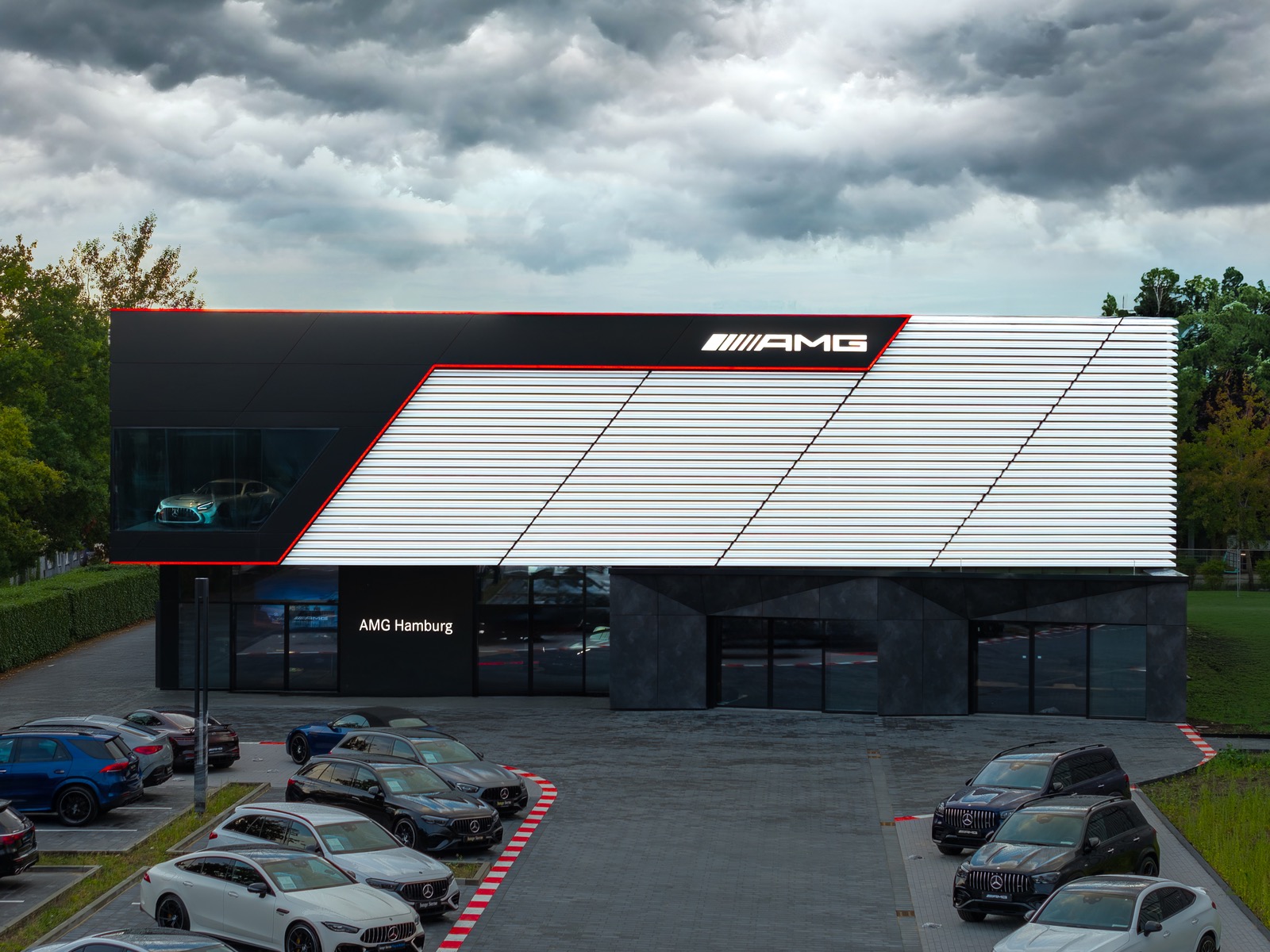 Das architektonische Konzept greift Elemente der AMG Formensprache auf und lässt die Dynamik und Exklusivität der Marke bereits von außen spürbar werden: So besticht die Gebäudefassade durch ihre außergewöhnliche Optik mit wiederkehrenden 52°-Winkeln, die das ikonische Logo von AMG aufgreifen. Eine indirekte Beleuchtung mit roten LED-Lichtbändern erinnert an die Linienführung von Rennstrecken. Besonderes Highlight ist ein zwölf Meter breites und drei Meter hohes Panorama-Eckfenster im Obergeschoss, das den Blick auf ausgewählte Ausstellungsfahrzeuge eröffnet. Auch im Inneren des Gebäudes setzt sich die charakteristische AMG Markenarchitektur konsequent fort. Dezente Grautöne, puristische Sichtbetonwände und spezieller Steinteppich mit Rennasphalt-Appeal schaffen im innovativen Showroom die Bühne für die bis zu zwölf ausgestellten Performance-Modelle.