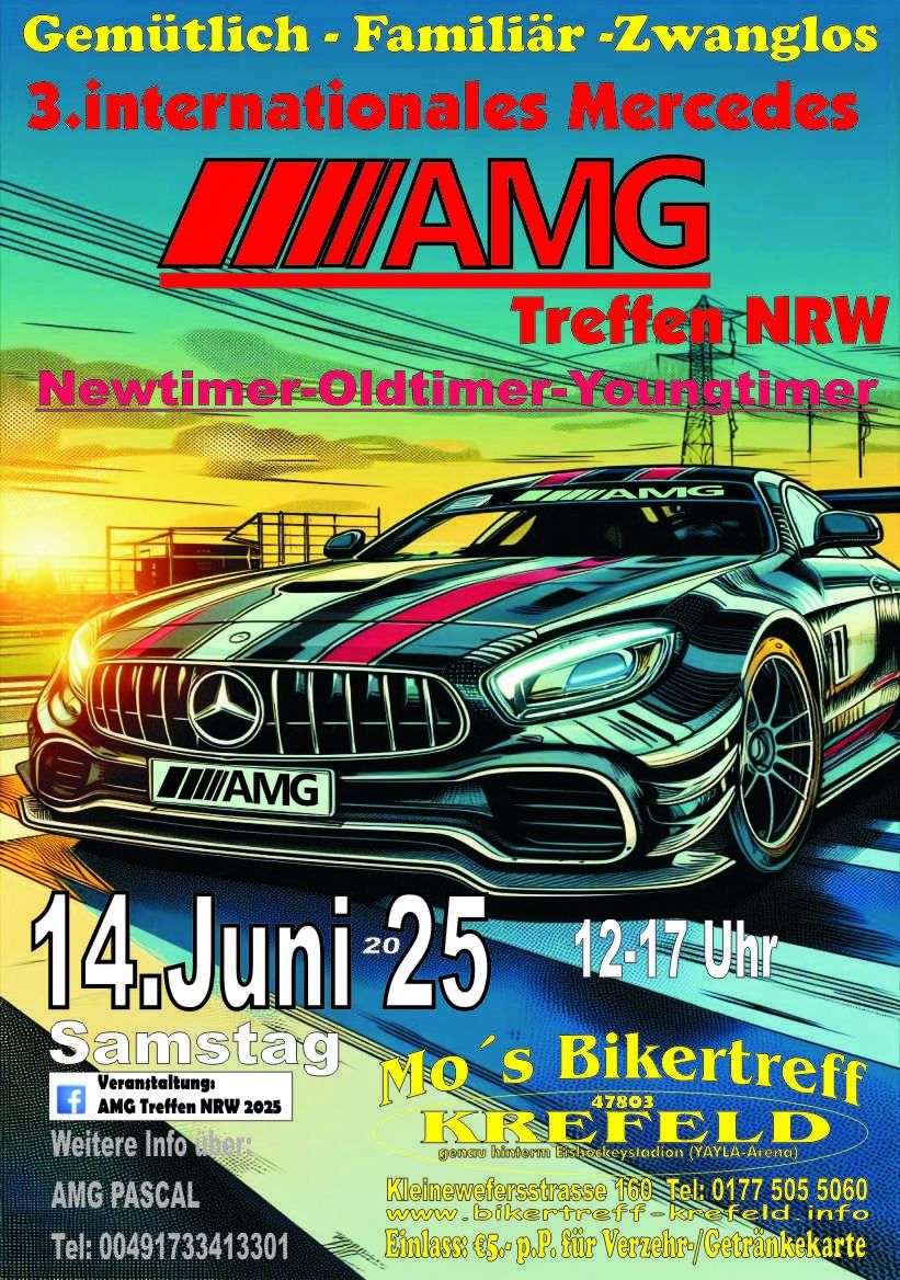Ein gemütliches Beisammensein aller AMG-Fahrer/innen mit den ensprechenden Fahrzeugen zum 3. in Krefeld bei Mo´s Bikertreff. Die @AMG_Driver_Society ruft alle auf, zu einem zwanglosen Treffen auf fast 19.000qm² asphaltierter Parkfläche, allerdings ohne Burn outs, Musikbeschallungen oder ähnliches.
