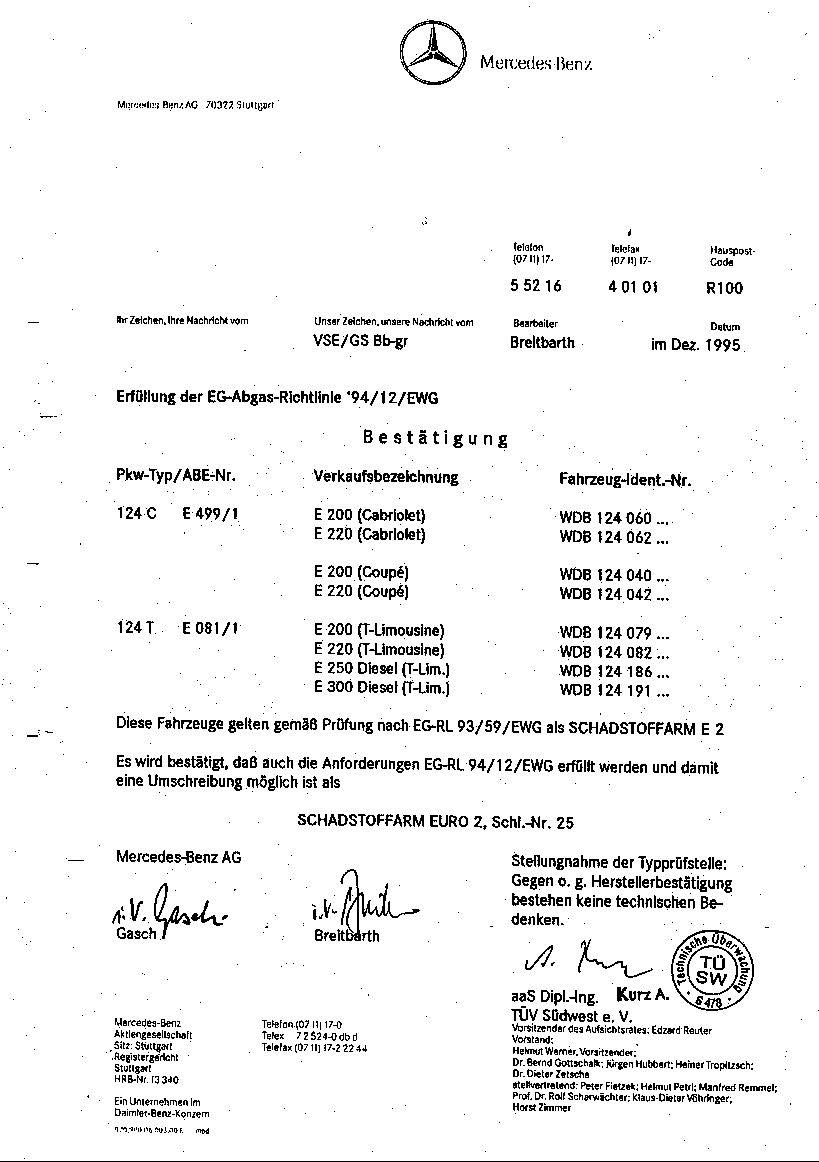Die Daimler-Benz AG (früher Mercedes-Benz AG) bestätigt für die oben genannten Fzg.-Typen, daß die Übereinstimmung mit der Serienüberprüfung (CoP) gemäß der RREG 70/220 EWG in der Fassung 94/12/EG gewährleistet ist.