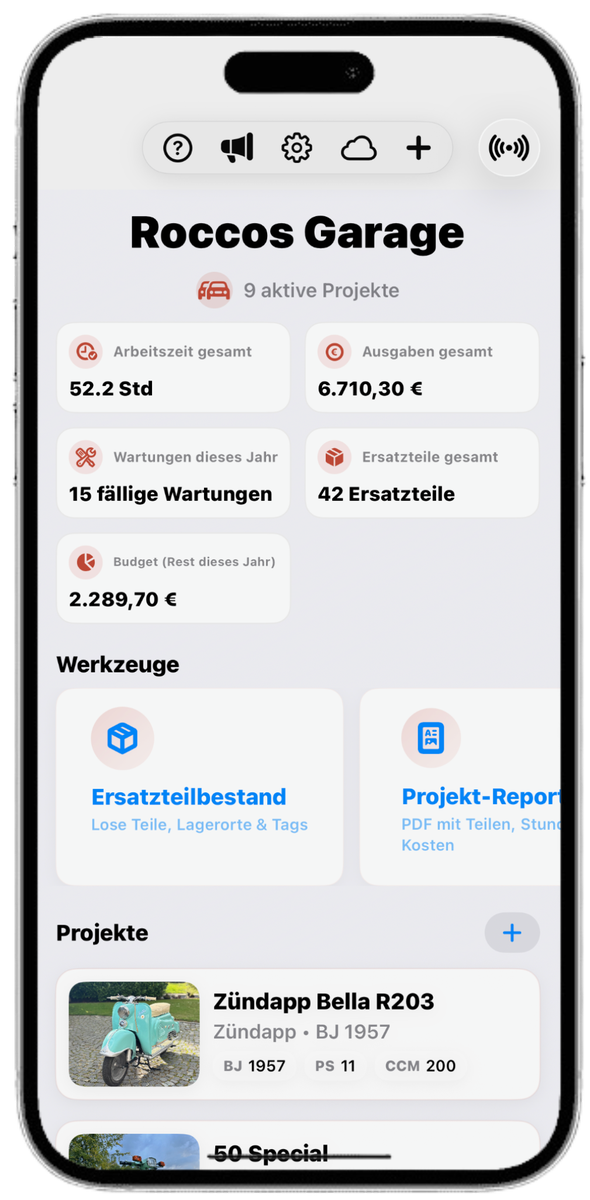 - Webseite: Restaurator – Alle Projekte. Alle Teile. Alle Belege – in einer App.