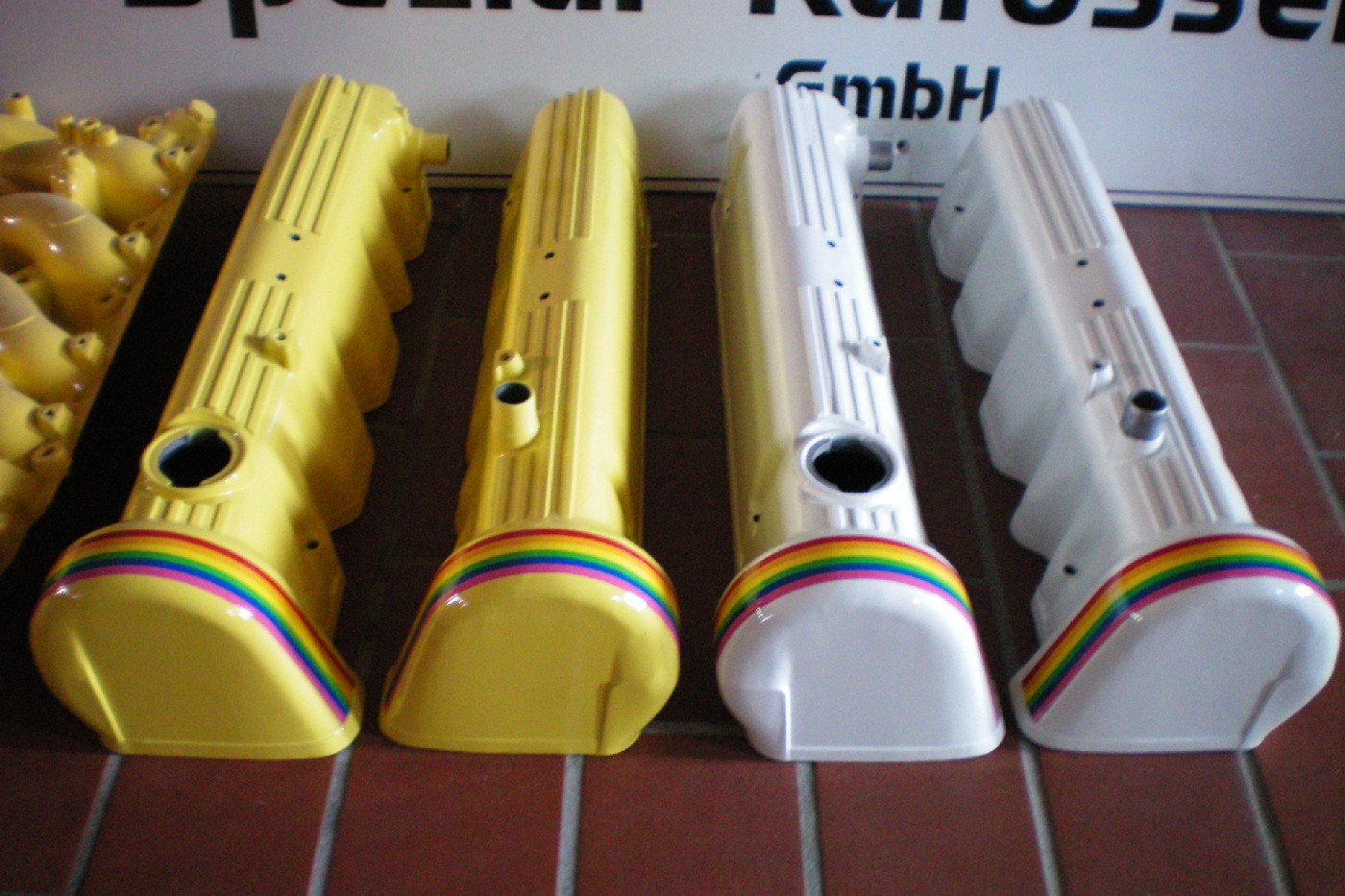 Habe heute die Ventildeckel vom Pulverbeschichter abgeholt und bin ganz begeistert üer den Effekt! Die weissen für meinen breiten SGS Gullwing und die gelben......?! Keine Ahnung, erstmal an die Wand!:clap: