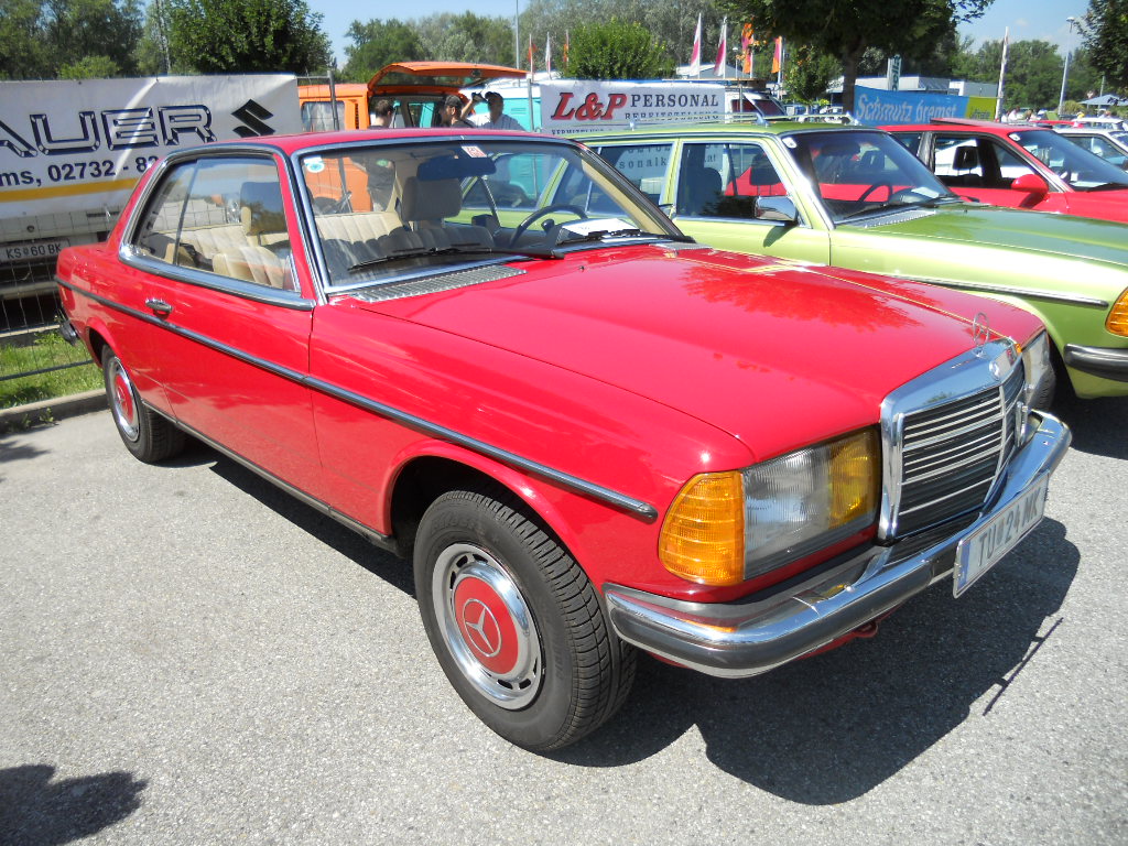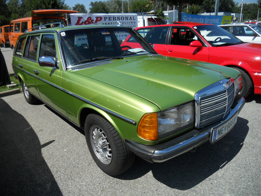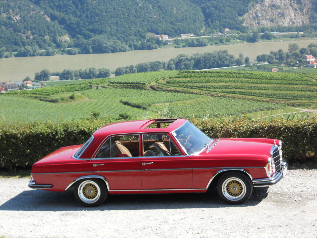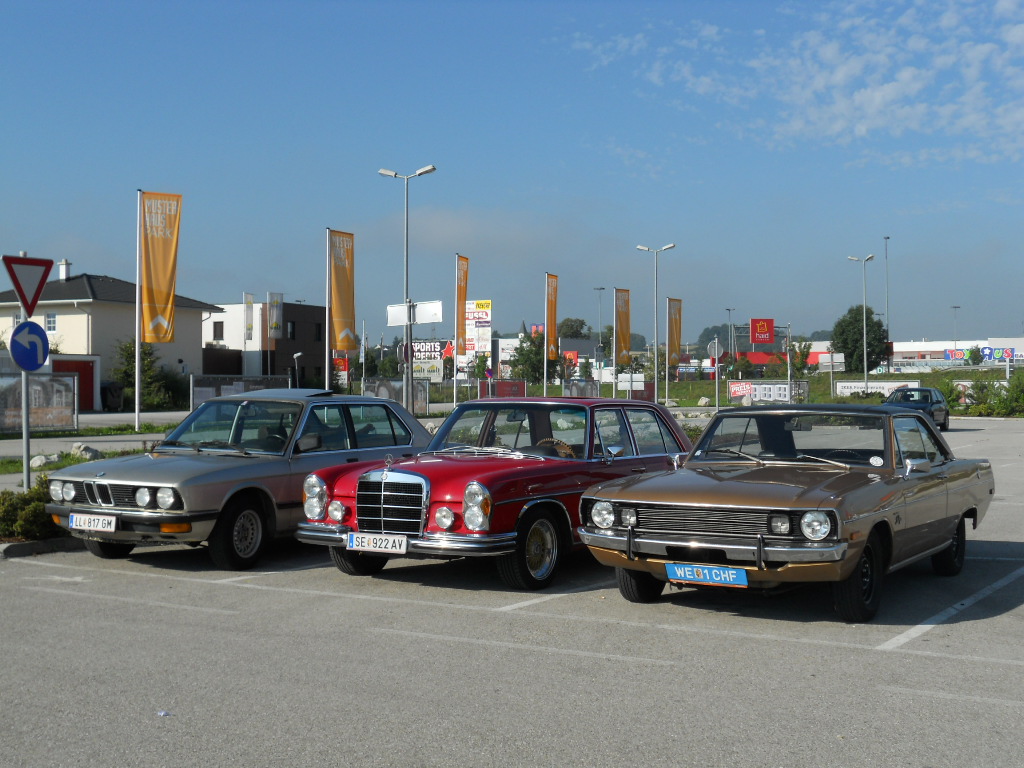 Mein signalroter W 108, jetzt endlich mit goldenen BBS-Felgen, machte sich zusammen mit einem 72er Dodge Dart und einem 1984er BMW 520i auf den Weg.