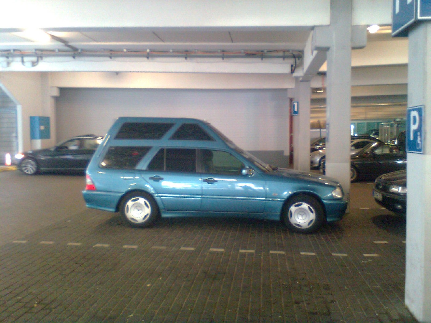 Den hier habe ich neulich mal in einem Parkhaus entdeckt: C-Klasse T-Modell umgebaut zum Behindertenfahrzeug! So etwas kannte ich bislang eher auf Basis frontgetriebener Kombis. Eine angetriebene Hinterachse müßte da doch eigentlich ziemlich im Weg sein?!