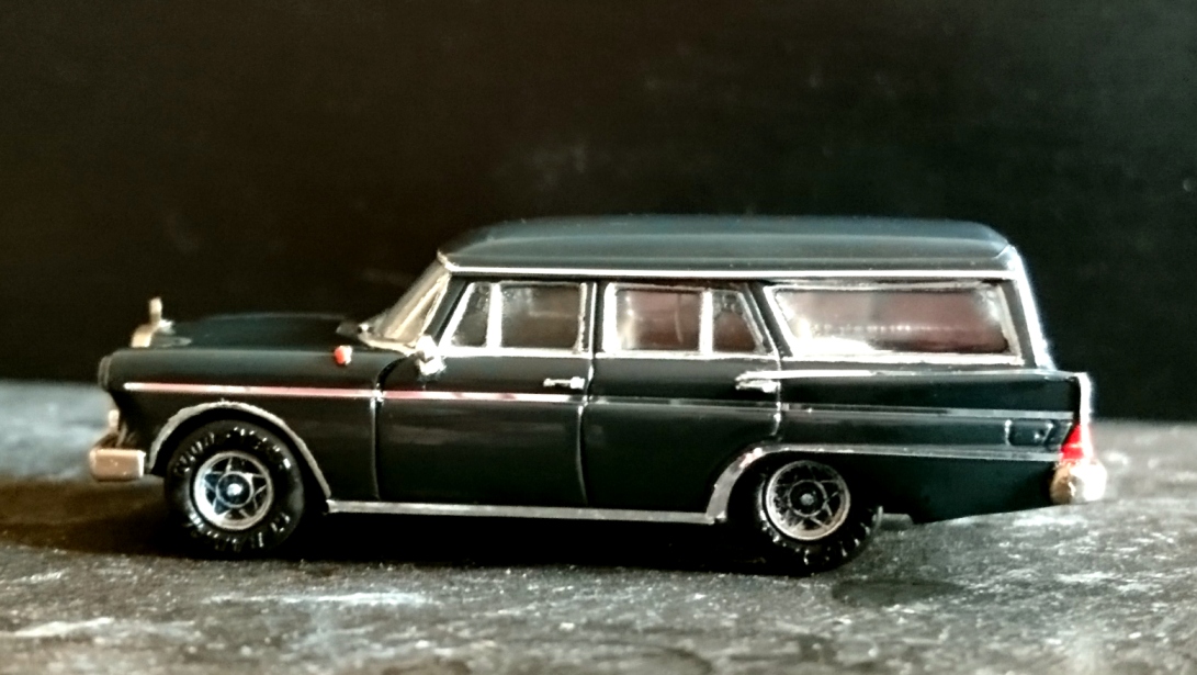 Hier handelt es sich um ein frühes Modell von BREKINA, eine Heckflosse Universal im Maßstab 1/87, gesupert mit Chromfolie, Japanpinsel und Felgen eines Modellzubehör Lieferanten. Dazu kam meine Fantasie. Leistung sollte unter der Haube sein.Damals wäre es wahrscheinlich ein 280 SE Motor gewesen.