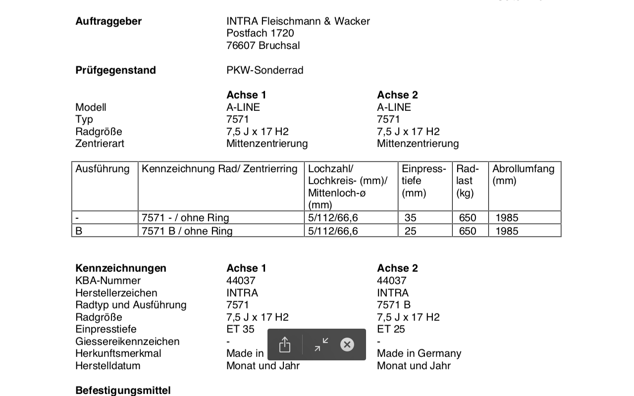 Speziell die Einpresstiefe interessiert mich und eine eventuelle Kopie eines Gutachtens.
