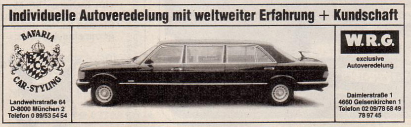 Typisch, man bringt die Autozeitschriften der letzten paar Monate auf den Dachboden, blättert dabei wahllos in ein paar alten AMS, und "stolpert" über einen Benz-Veredler, den man so gar nicht auf dem Schirm hat. Obwohl die Firma W.R.G. aus Jelsenkirschen doch zumindest Anfang 1984 in jedem Heft fleissig inseriert hat: