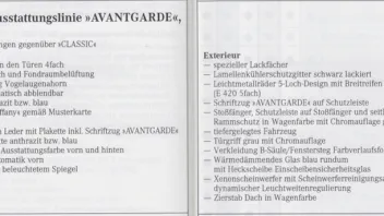 Im Innenraum weißt der Avantgarde die gleiche Zusatzausstattung wie die Elegance Ausführung auf. Abweichend hiervon haben die Polster die Musterung „Tiffany“ und die Schalt- bzw. Wählhebelplakette den Schriftzug Avantgarde. Der Innenraum wird mit dunklen Vogelaugenahorn-Edelholz aufgewertet. Schalt- und Wählhebel, Lederlenkrad und die Sicherheitsgurte sind bei dieser Ausstattungslinie immer in schwarz gehalten.